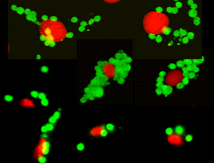 I work with the intracellular parasite, Leishmania spp.  My research examines the various ways Leishmania are able to evade and exploit the host immune response.  The major aspect of the immune response that I study is antibody production.  We have examined antibody production during visceral leishmaniasis and demonstrated a positive correlation with antibody levels and disease severity.  The immune system produces antibodies to coat pathogens, and subsequently clear them by phagocytosis.  Leishmania spp can exploit this process.  We demonstrate that high IgG titers lead to the production of Il-10 by macrophages.  This IL-10 is immunosuppressive.  The picture below shows intracellular Leishmania inside a macrophage.  The macrophage nuclei are red and the parasites are green.  These parasites were stained with antibody to host IgG.  Thus, intracellular amastigotes of Leishmania have IgG on their surface.