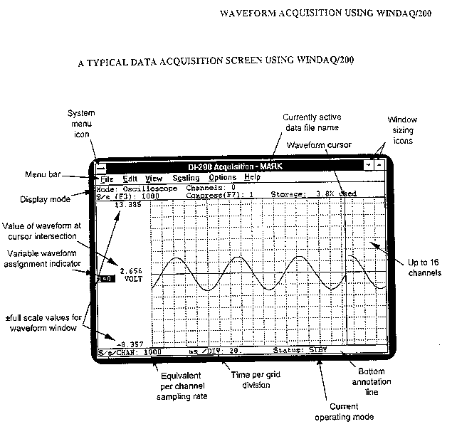 Status and Annotation Bars: The Status bar at the top of the screen (below the menu choices) displays the settings of all current data acquisition parameters and what % of the data file is filled. Double clicking the MODE field toggles between the scroll and oscilloscope modes. Double click the CHANNELS and COMPRESSION fields and examine the results.