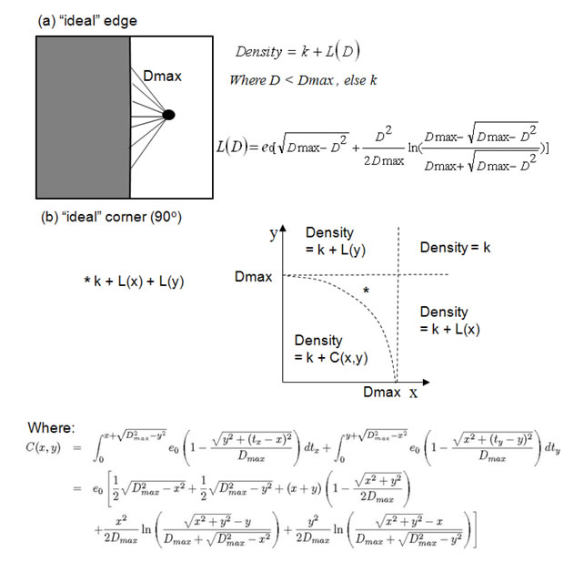 In the original paper, the only solution presented was for a point along an “ideal” edge that is perfectly straight, divides two habitats only, and extends to infinity in both directions (see panel a below). However, the model was intended to be used in more complex patch shapes, and Malcolm (1994) noted that the model could be used on patches of any shape. The solution for a perfect corner gives an indication of why this model has never been implemented in real landscapes (see panel b below). This solution is only applicable to a perfect corner and even a corner of slightly different geometry (e.g., 89 degrees) would require a different solution. In reality, a unique solution is required for every patch in a typical landscape (except, perhaps, experimental landscapes). Obviously, the task of individually finding a unique solution to every patch on the landscape is intractable.