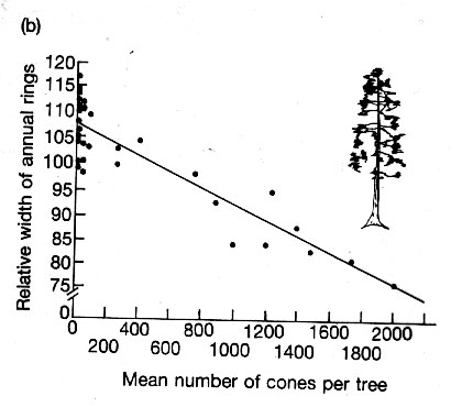 2. Tradeoffs between growth and reproduction. Ex. Pine growth and reproduction.