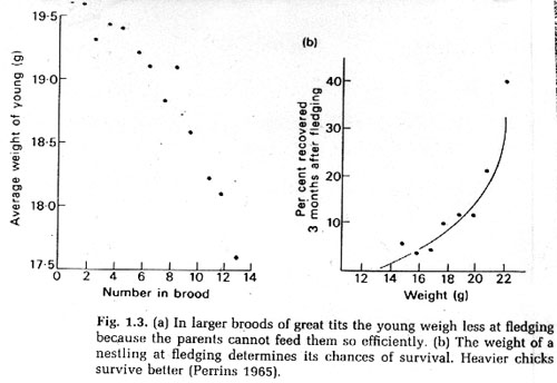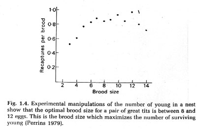 3. Tradeoffs between offspring quantity and offspring quality lead to an "optimal" solution (Ex. Great tits).