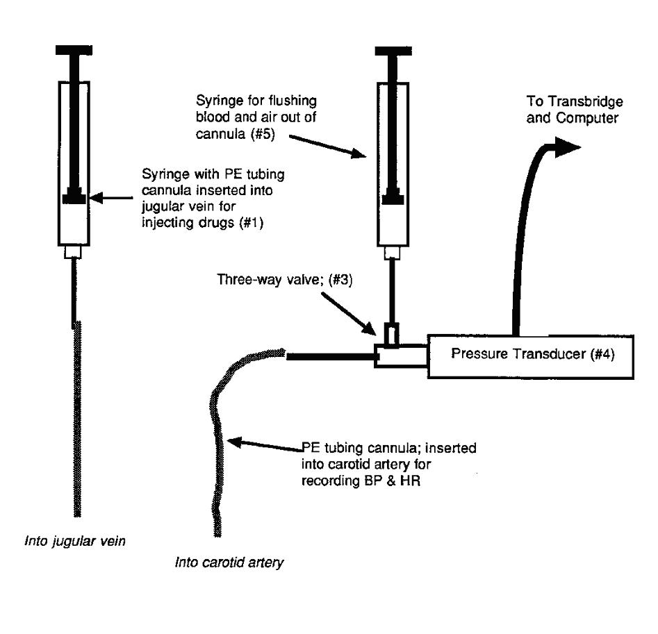Before beginning the surgical procedures, the blood pressure transducer must be flushed with heparinized saline (10 units/ml) and completely filled with fluid (no air bubbles!). This must be done before you insert the carotid cannula. Failure to eliminate the entrapped air will result in the recording of an inaccurate pulse pressure due to the compressibility and elasticity of air.