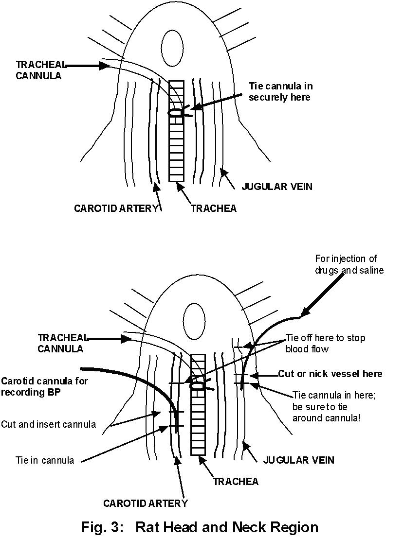 You will directly record BP, the rate and relative depth of respiration, and the electrocardiogram (ECG) of an anesthetized rat. Sections of small diameter polyethylene tubing (i.e., cannulas) will be inserted into a jugular vein (for injecting drugs) and into a carotid artery (for directly recording the BP). See Figure 2. A force-displacement transducer will record the rhythmical chest movements associated with inhalation and exhalation. All data will be recorded via the computer and the WINDAQ data acquisition program.