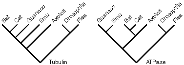 4. Assume that the trees shown represent the phylogenies determined from phylogenetic analysis of sequences of genes encoding Tubulin and ATPase. You will note that the two analyses have produced mutually incompatible trees. Which of the following is a plausible explanation for this observation?